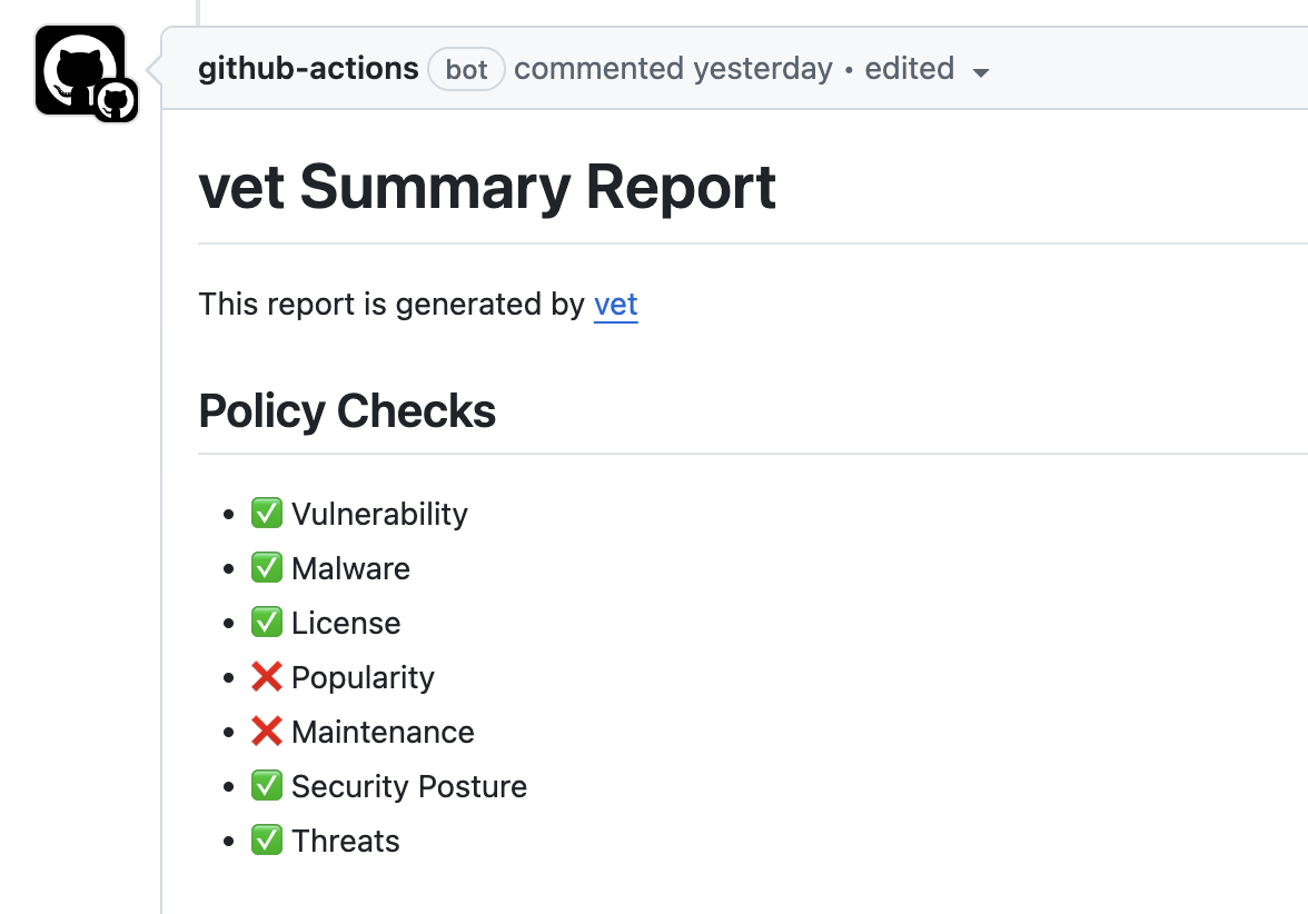 vet supports a native GitHub Action that can be used to easily setup a policy driven guardrail against risky OSS components. Refer to vet-action on setting up pull request integration for GitHub.